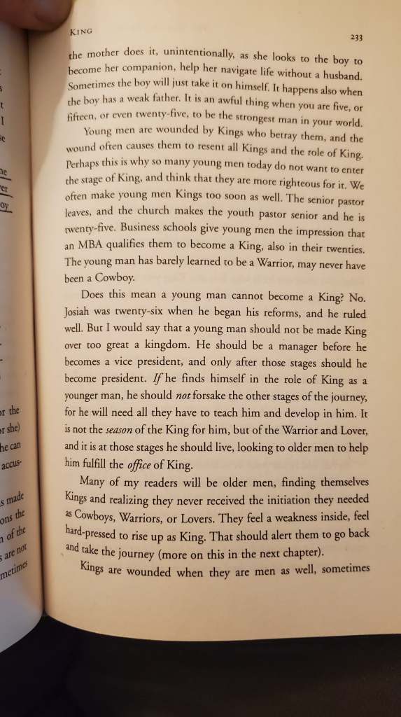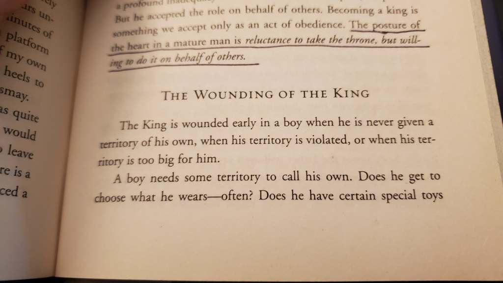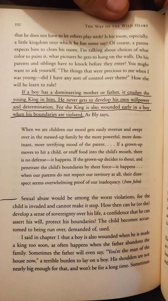 In this particular chapter John talks about the wounding of the king in their childhood. Things that parents have done and do to children that damage them. It’s interesting to me to read this because since February 2017 I have lived in the realm of Adverse Childhood Experiences. Meaning, I’ve been working with combat veterans and other folks who struggle with PTSD. I have sat for hours and listened to many men and women tell their personal stories with tears in my eyes. Many times reflecting on my own life and childhood and things that happened to me. I can personally attest to what Mr. Eldredge writes about. Especially when it comes to violating the boundaries or sovereign kingdom in the world of a young boy (or girl) and how it affects their lives into adulthood.