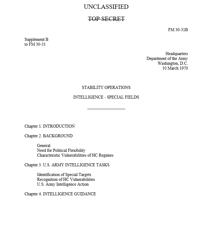 FM 30-31B, dated March 10, 1970, is a TOP SECRET supplement to FM 30-31, focusing on intelligence support for U.S. Army stability operations in HC nations. It targets HC agencies (armed forces, police, civilian bodies), advocating covert operations to advance U.S. interests (FM 30-31B, Page 2). Key sections include: